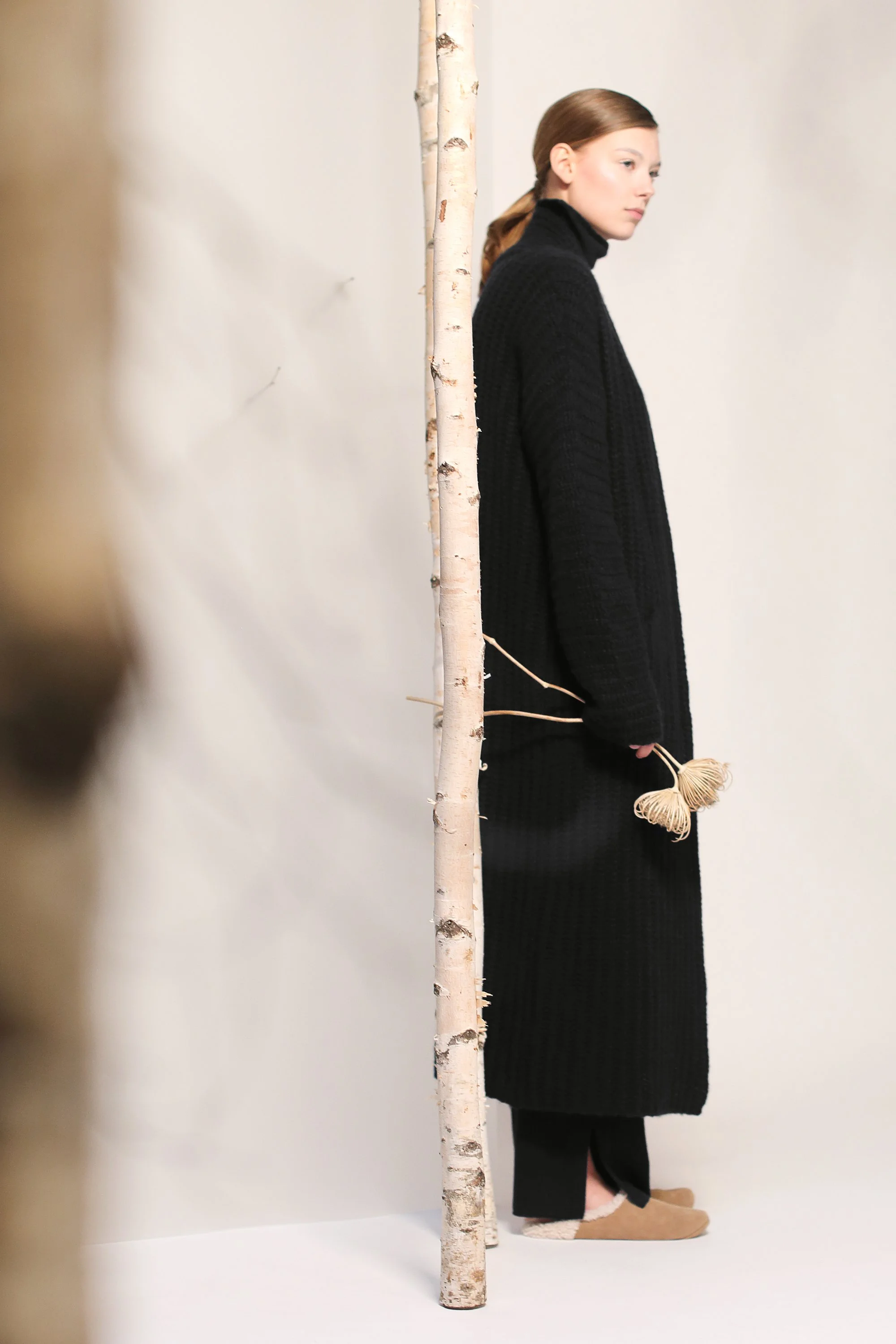 BRUSHED CASHMERE SILK IN COL. BLACK fluffy ribbed maxi coat + fluffy 1 Ply turtleneck + pure slitted pants