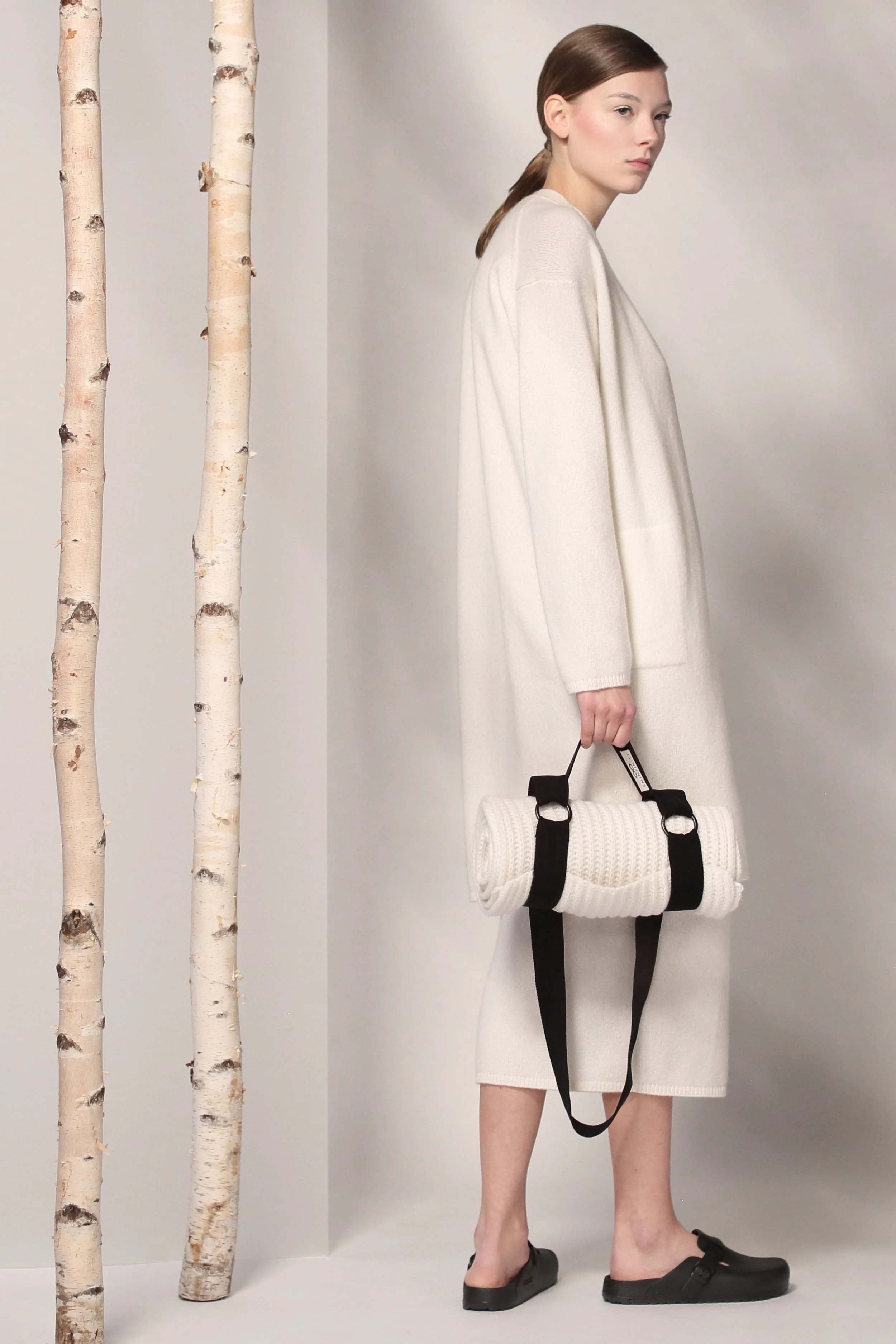 CASHMERE SILK IN COL. NIGHT fluffy ribbed maxi coat + fluffy 1 Ply tank dress + pure slitted pants