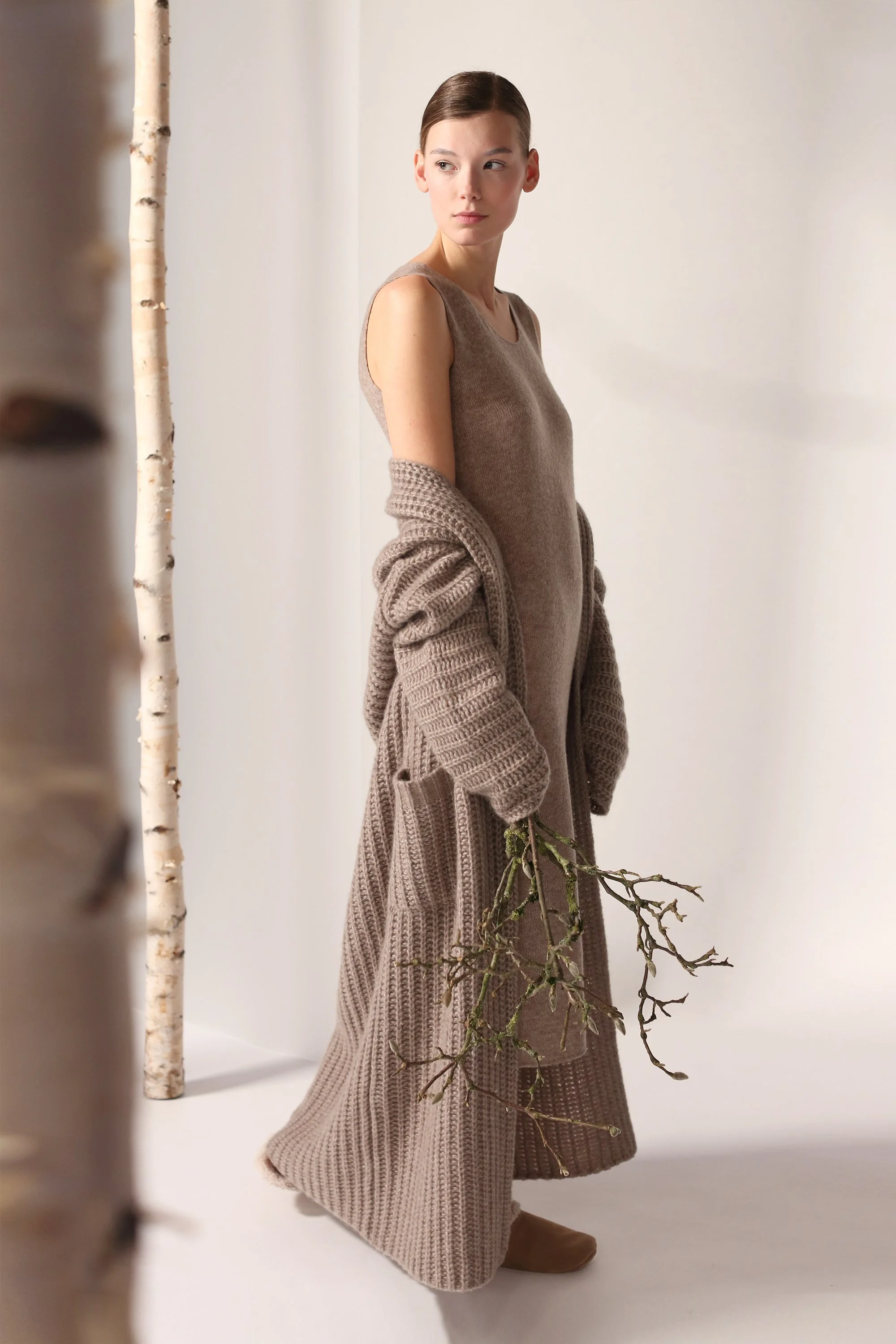 BRUSHED CASHMERE SILK IN COL. GRAIN fluffy 1 Ply tank dress + fluffy ribbed maxi coat