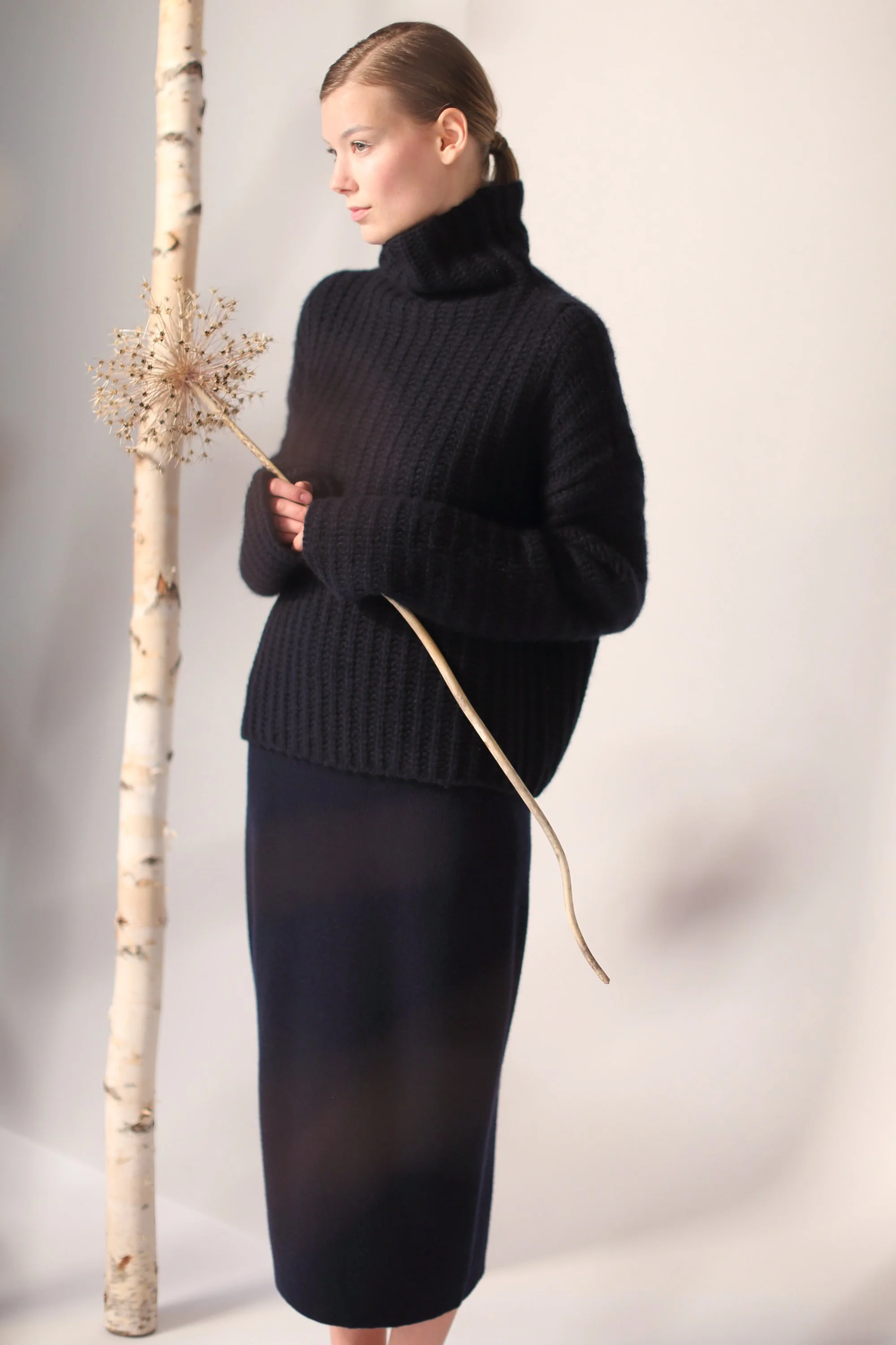 CASHMERE SILK IN COL. NIGHT fluffy ribbed turtleneck jumper + pure all needle tulip skirt